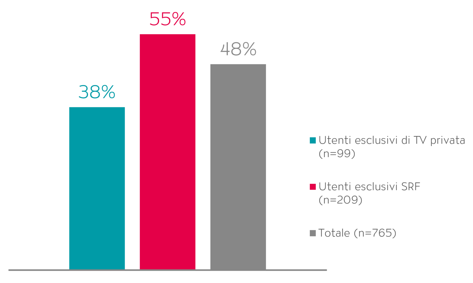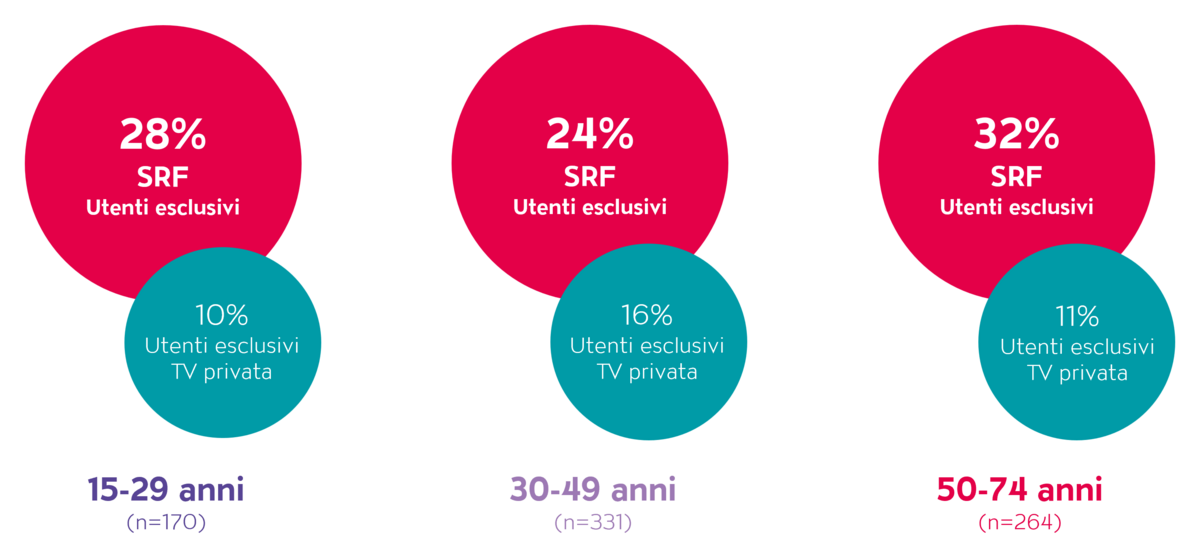 Il gruppo degli utenti esclusivi della SRF vanta quindi un numero di oltre il doppio superiore rispetto a coloro che accendono la TV solo sulle emittenti private.