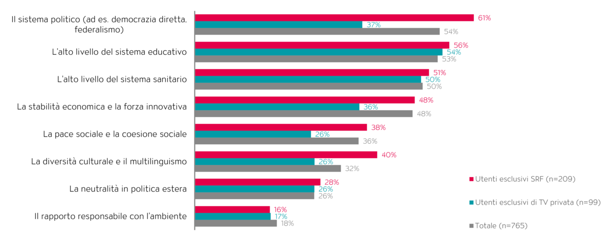 Chiedendo l’opinione sui punti di forza della Svizzera alle persone partecipanti, si delinea un quadro significativamente diverso a seconda delle emittenti guardate. Oggetto delle domande sono stati in particolare il sistema politico, il sistema educativo e sanitario, la stabilità economica e la forza innovativa. Gli utenti esclusivi della SRF, con una percentuale del 61%, considerano molto più spesso il sistema politico come un punto di forza del Paese rispetto agli utenti esclusivi di un’emittente privata (37%), dimostrando così un maggiore fiducia nel sistema. Anche la coesione sociale e la varietà culturale viene percepita dagli spettatori della SRF come arricchimento con una frequenza superiore alla media. Nella valutazione della stabilità economica e del sistema sanitario i punti di vista dei diversi gruppi sono più vicini, ma anche in questi ambiti il gruppo di utenti esclusivi della SRF presenta valori di approvazione tendenzialmente più alti (cfr. fig. 2).