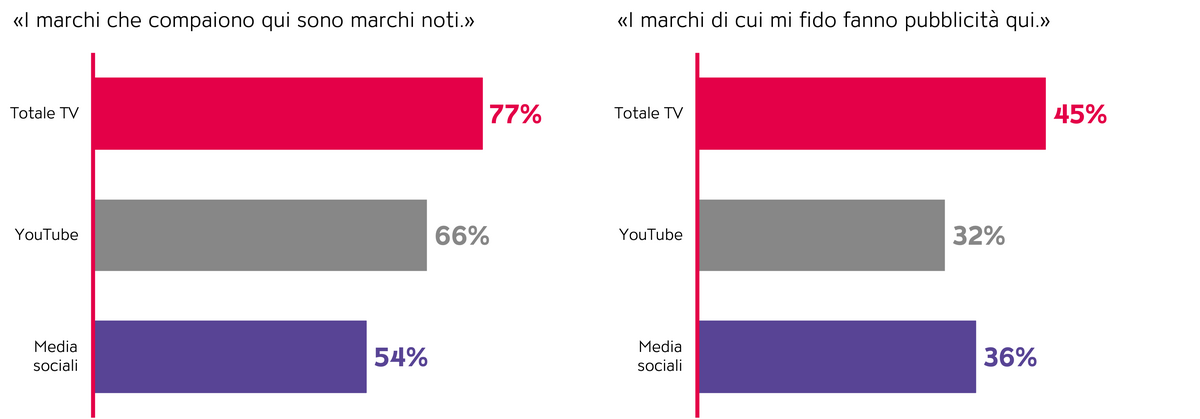 In sintesi, si può notare che la TV e i social media presentano contenuti e modelli di utilizzo diversi. La minore frequenza pubblicitaria in TV, unita a un ambiente più chiaro e meno distraente, contribuisce a far sì che la pubblicità TV sia percepita come più professionale e di qualità. Inoltre, la pubblicità TV riesce a ottenere il massimo consenso da parte dei consumatori. Per quanto riguarda il ricordo della pubblicità, è evidente che la pubblicità sui social media è poco ricordata, al contrario della pubblicità sui canali televisivi (15% di ricordo spontaneo del marchio). Lo studio dimostra che la TV (lineare e BVOD) può essere definita un ambiente premium di qualità elevata, in quanto i consumatori riconoscono e si fidano maggiormente dei marchi che fanno pubblicità in TV.