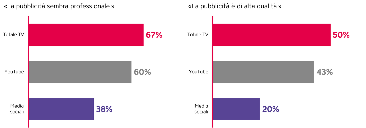 Un carico pubblicitario elevato difficilmente migliora la percezione o la qualità del servizio. Per quasi il 70% degli intervistati la pubblicità TV viene percepita come professionale e per il 50% come di alta qualità. Per la pubblicità sui social media, invece, questi valori si attestano rispettivamente al 38% e al 20%. La TV è considerata un mezzo di livello superiore, caratterizzato da un’elevata qualità di produzione e da un chiaro target di riferimento.