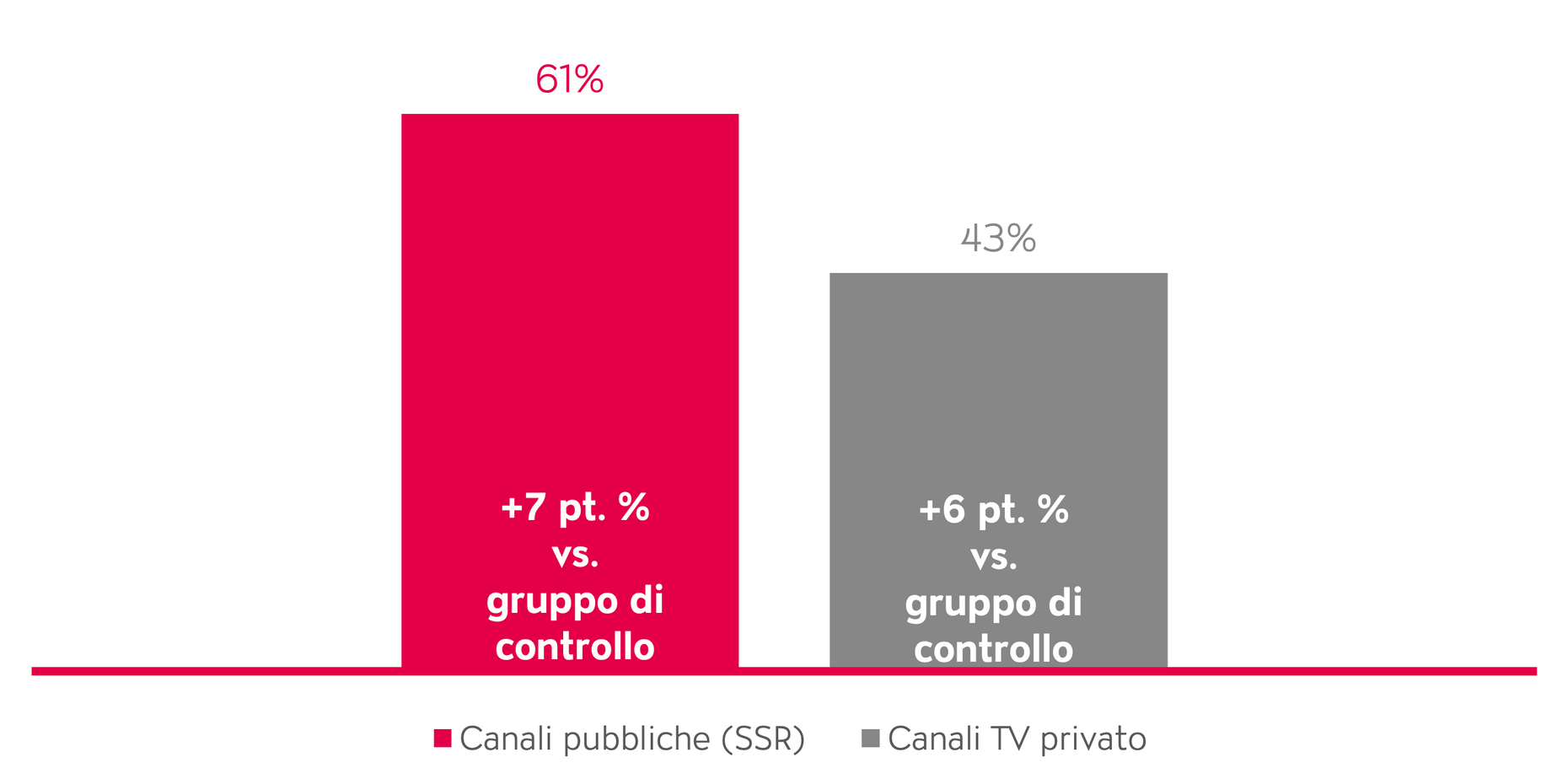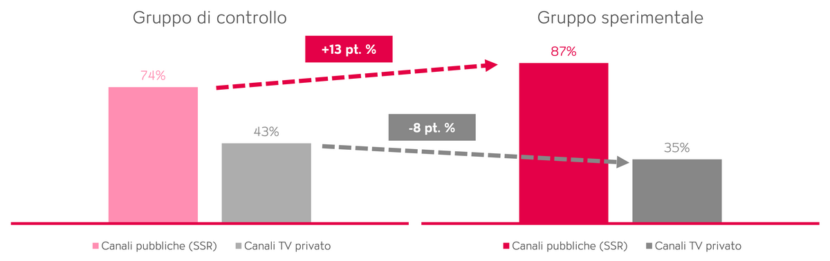 I risultati del gruppo sperimentale dimostrano che spettatrici e spettatori comparano i contenuti visti con le loro idee precedenti. Per quanto riguarda la qualità, il consumo delle trasmissioni sia sulle emittenti pubbliche (SSR) che su quelle private ne comporta una migliore percezione. Pertanto, il gruppo sperimentale, in cui le trasmissioni televisive sono state guardate per poi sottoporre a riflessione la relativa visione, giudica in maniera più positiva la qualità dei canali televisivi. Ciò si riflette anche nelle affermazioni originali delle persone partecipanti, ad esempio: «SRF offre intrattenimento, informazioni, reportage di approfondimento e documentazione di altissimo livello. Offre programmi utili a crescere, ad ampliare le conoscenze, a stimolare la riflessione, ma anche a suscitare emozioni, a prescindere che ti facciano ridere o piangere.»
