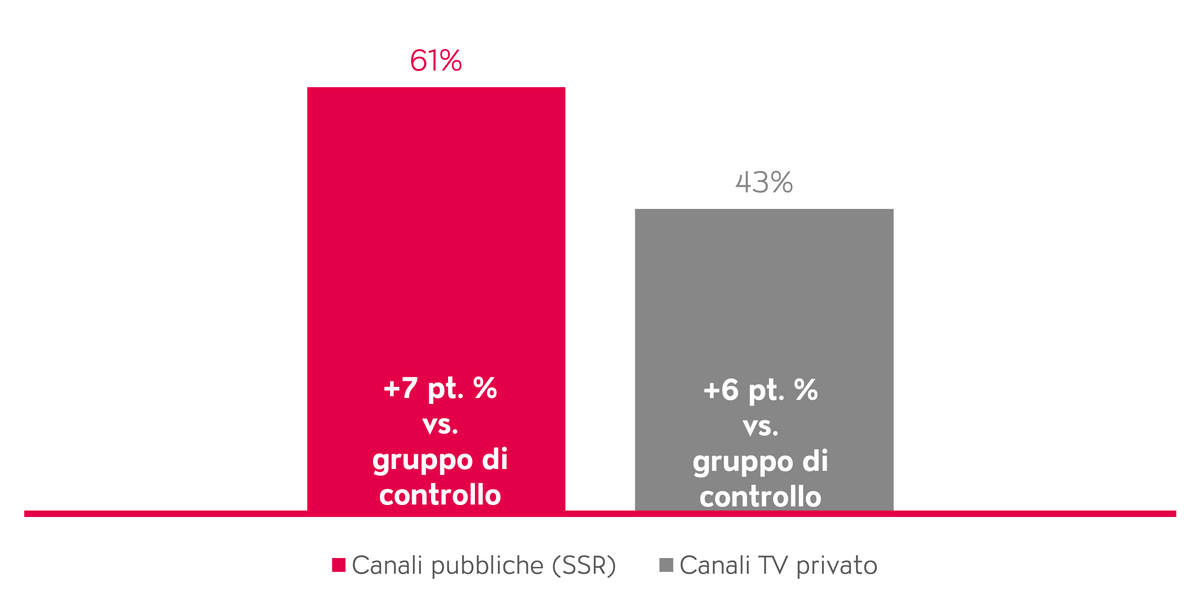 Per quanto riguarda le emittenti pubbliche, osserviamo lo stesso effetto rilevato nell’ambito della valutazione della qualità: mentre nel gruppo di controllo il giudizio positivo in termini di responsabilità sociale è del 74%, nel gruppo sperimentale sale all’87%, un giudizio che si spiega soprattutto con il consumo attivo dei contenuti. Temi come la cibersicurezza, l’approvvigionamento energetico e la politica quotidiana sono stati segnalati come particolarmente importanti, in quanto trattati in modo approfondito sulle emittenti SSR e illustrati da diverse prospettive.