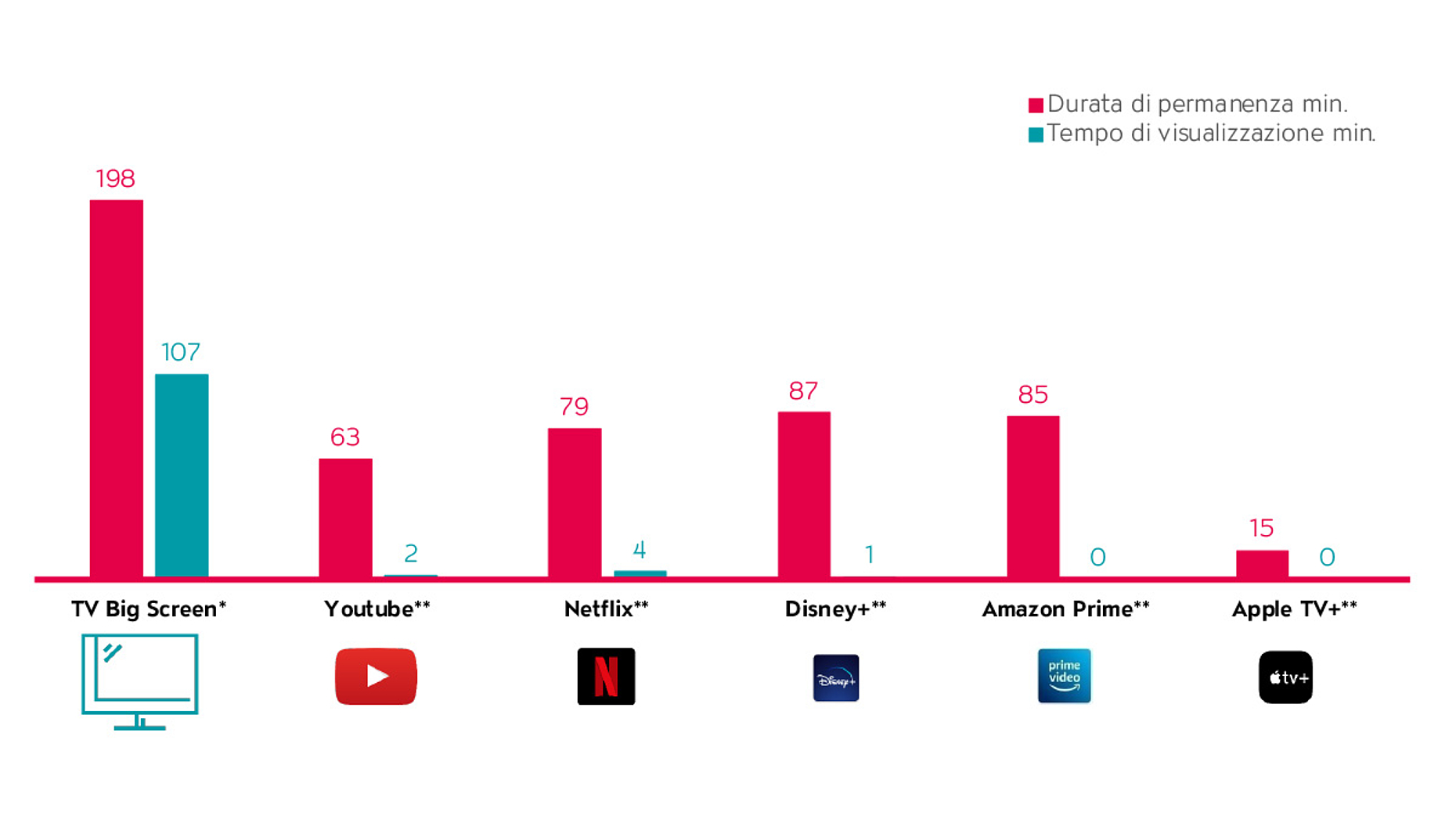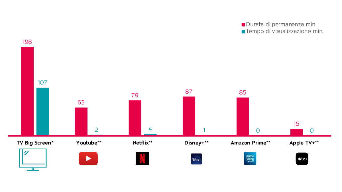 È emerso che YouTube, con 2 minuti a testa, non genera quasi alcun tempo di visualizzazione sul Big Screen. Mancano una base di utenti ampia e la disponibilità degli utenti a fruire di contenuti tramite questo canale sul Big Screen per un periodo di tempo più lungo. Gli utenti trascorrono in media solo 63 minuti su YouTube sul Big Screen. La TV sul Big Screen raggiunge una durata di permanenza, ovvero la disponibilità a lasciarsi coinvolgere a lungo dai contenuti, di ben 198 minuti per utente, consentendo così un posizionamento efficace della pubblicità. Il tempo di permanenza pro capite al giorno per la TV è quindi tre volte superiore a quello di YouTube.