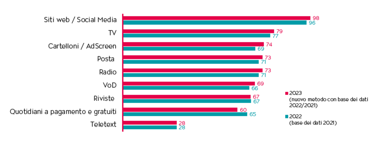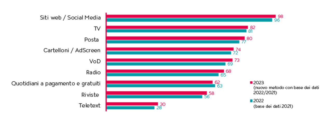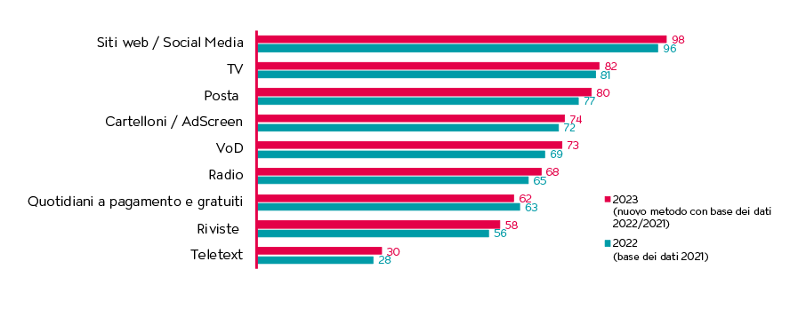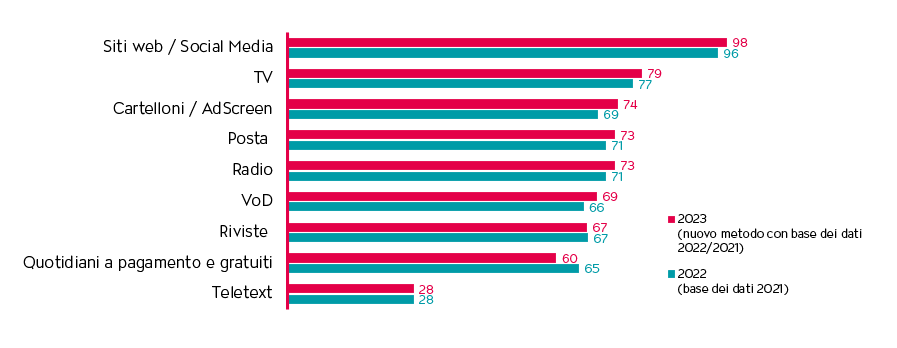 Il nuovo metodo prevedeva un periodo di analisi di due anni e l’ampliamento del panel da 3’404 a 8’229 persone, modifiche che tuttavia non hanno comportato alcun risultato inatteso. La pubblicità in TV raggiunge circa il 79% della popolazione nella Svizzera tedesca e circa l’82% nella Svizzera francese, con una frequenza che si attesta ad almeno «più volte alla settimana». Solo i servizi web e le app registrano valori superiori.
