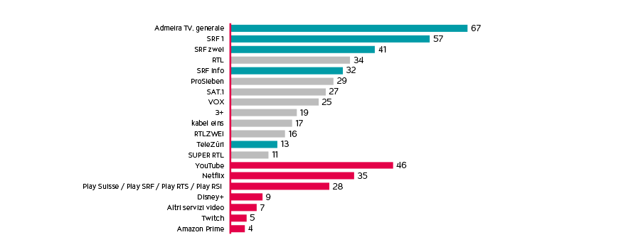 Con un consumo pari al 67% per più volte alla settimana nella Svizzera tedesca, il portafoglio televisivo di Admeira si colloca in cima alla categoria della TV. Nella Svizzera romanda la penetrazione delle nostre emittenti è addirittura del 78%. Un’attenta analisi dei canali televisivi dimostra che senza Admeira non sarebbe possibile raggiungere un bacino di utenti di tali dimensioni e in così poco tempo. In entrambe le regioni linguistiche, il portfolio di Admeira comprende i primi due canali televisivi principali.