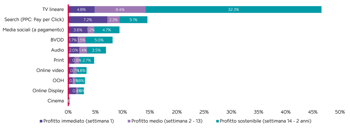 Tutti i canali pubblicitari impiegati mostrano in media un aumento della quota di profitto grazie alla pubblicità e questo anche nel breve e medio termine. Gli investimenti in TV (lineare e BVOD) o nella sola TV lineare generano sia a breve che a lungo termine le massime quote di guadagno possibili attraverso la pubblicità nel Media mix (v. fig. 3). Grazie all’eccezionale impatto pubblicitario e all’elevata penetrazione, la TV garantisce un ritorno in termini di vendite più elevato rispetto ad altri canali mediatici.