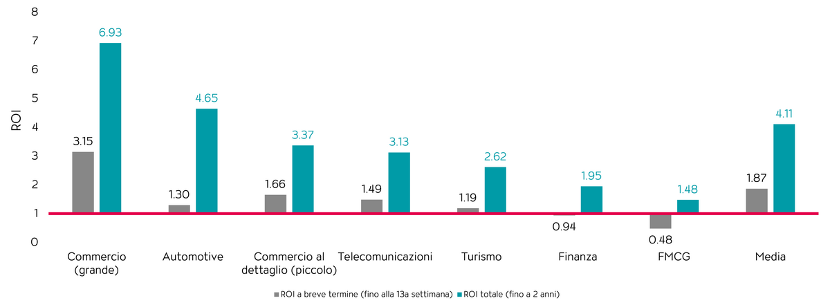 Secondo lo studio britannico, il Return on Investment (ROI) a breve termine fino alla 13ª settimana, calcolato tra i vari settori, è in media di £1.87, il che significa che ogni sterlina investita in pubblicità genera un utile di £1.87. Se lo si osserva sul lungo periodo, tenendo conto degli effetti a lungo termine, il ROI totale sale a £4.11. Ciò rispecchia l’intero volume dei profitti che si ottiene a lungo termine grazie alle iniziative pubblicitarie. Il risultato è un utile complessivo di £4,11 per ogni sterlina investita, a conferma dell’efficacia e della redditività della pubblicità a lungo termine.