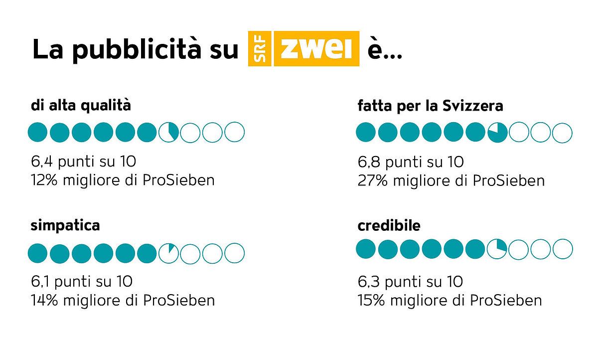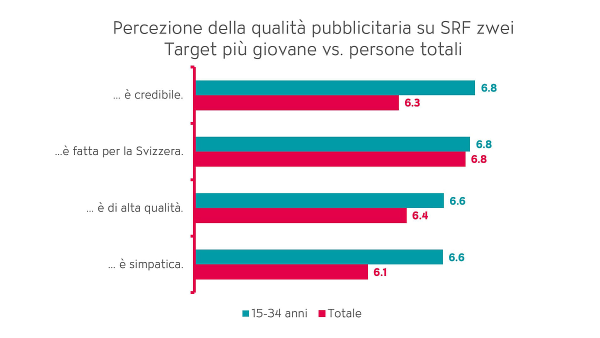 Anche la pubblicità su SRF zwei ha ricevuto valutazioni straordinarie. Gli intervistati e le intervistate hanno assegnato 6,4 punti alla qualità della pubblicità su SRF zwei, 6,8 punti alla swissness, 6,1 punti alla simpatia e 6,3 punti alla credibilità.