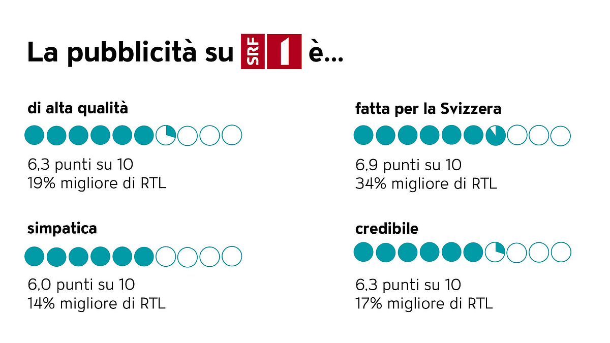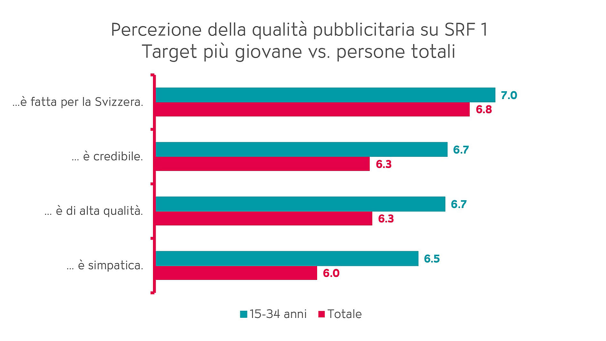 Su entrambi i canali SRF in oggetto, la qualità pubblicitaria percepita ottiene quindi risultati migliori rispetto alla concorrenza. La percezione dello spazio pubblicitario fa la differenza.