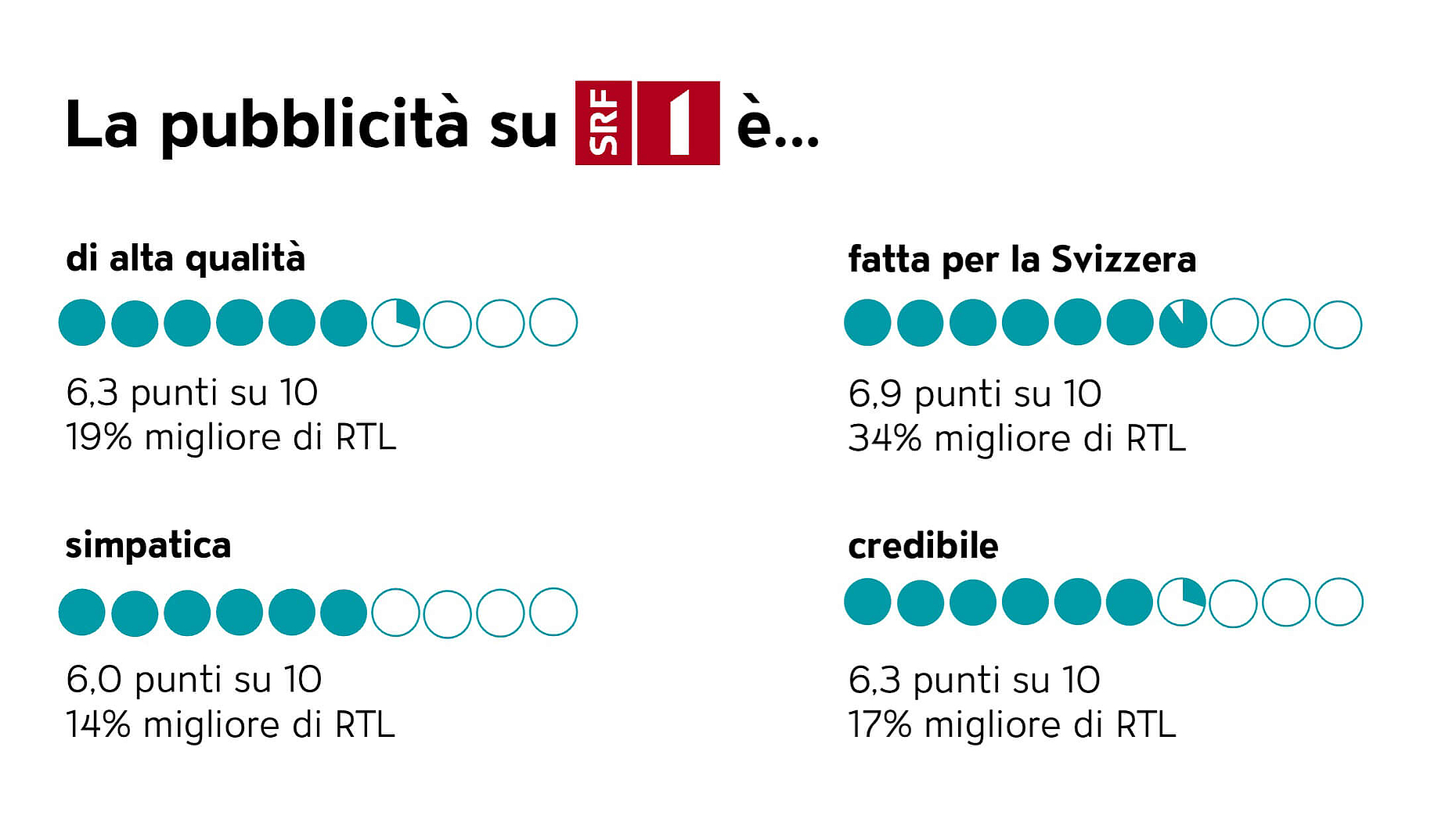 I risultati del sondaggio confermano la posizione di leader nel mercato pubblicitario delle emittenti di SRF. Su SRF 1 la qualità della pubblicità viene valutata con 6,3 punti su una scala da 10 punti. Per la «swissness» della pubblicità sono stati assegnati 6,9 punti, per la simpatia 6 e per la credibilità 6,3 punti. Gli altri criteri qualitativi sono consultabili nel paper dello studio (cfr. sotto).