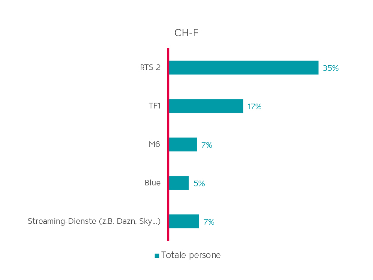 Lo sport è onnipresente nella società svizzera. Il 58% della popolazione svizzera pratica spesso sport. L’elevata affinità per lo sport in Svizzera si riflette anche nelle abitudini mediatiche. Il 36% segue regolarmente eventi sportivi live e programmi sportivi in TV. Per quanto riguarda la preferenza del canale per le trasmissioni sportive in diretta, emerge una chiara tendenza: il 44% preferisce SRF zwei, mentre il 6% menziona i servizi di streaming (come Sky o DAZN), seguiti da RTL/RTL+ e Blue con il 4% ciascuno (fig. 3). Nella Svizzera romanda, RTS 2 è in testa alle preferenze con il 35%, davanti a TF1 con il 17%, M6 e i servizi di streaming con il 7% ciascuno e Blue con il 5% (fig. 4).