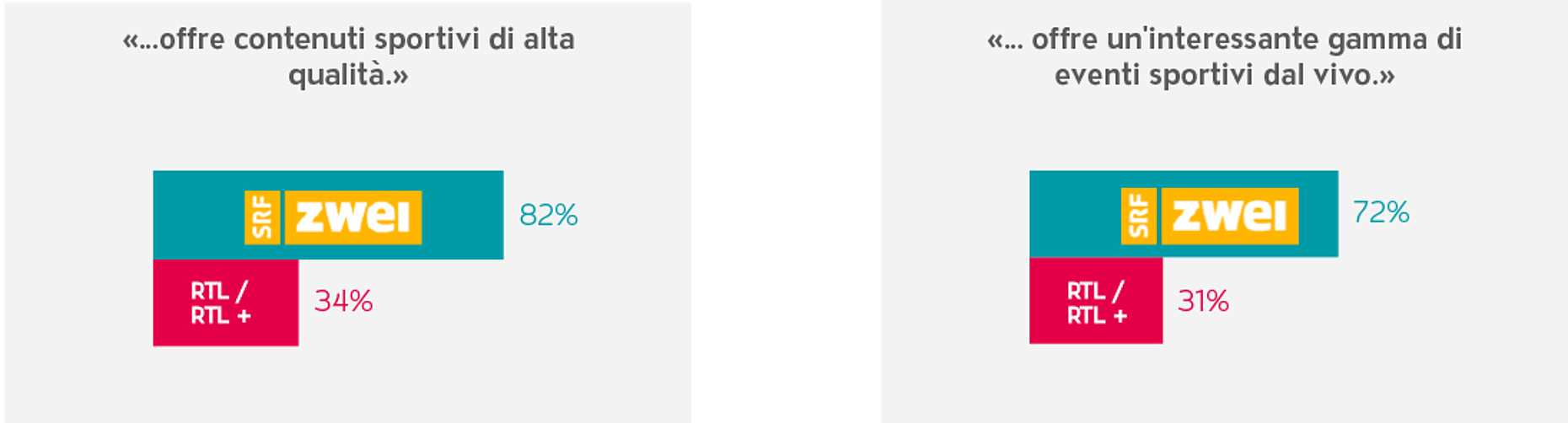 SRF zwei e RTS 2 si rivelano i canali sportivi più importanti della Svizzera. Nella Svizzera tedesca, l’82% delle persone intervistate attesta l’elevata qualità dei contenuti sportivi di SRF zwei, mentre nel caso di RTL/RTL+ solo un terzo è dello stesso parere. Il 72% di coloro che hanno partecipato allo studio trova, inoltre, interessante l’offerta di eventi sportivi live su SRF zwei, che ottiene così un numero di consensi più che doppio rispetto all’emittente privata tedesca RTL/RTL+ (v. fig. 1).