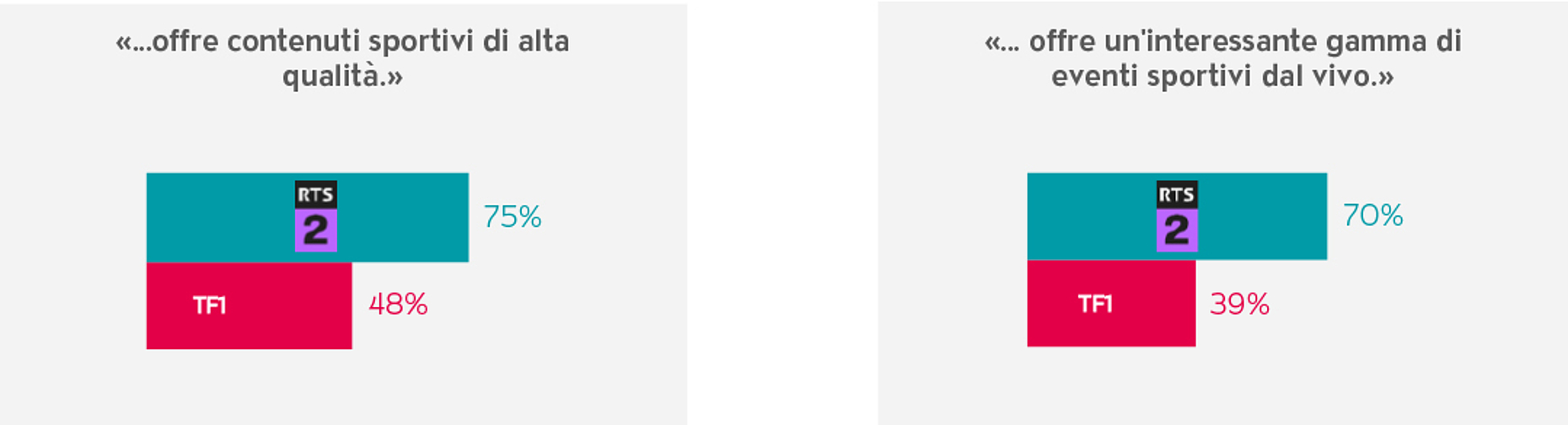 Anche nella Svizzera francese la programmazione della SSR supera di gran lunga la concorrenza privata: il 75% delle persone intervistate conferma l’elevata qualità dei contenuti sportivi e il 70% l’interessante offerta di eventi sportivi live su RTS 2 (v. fig. 2)