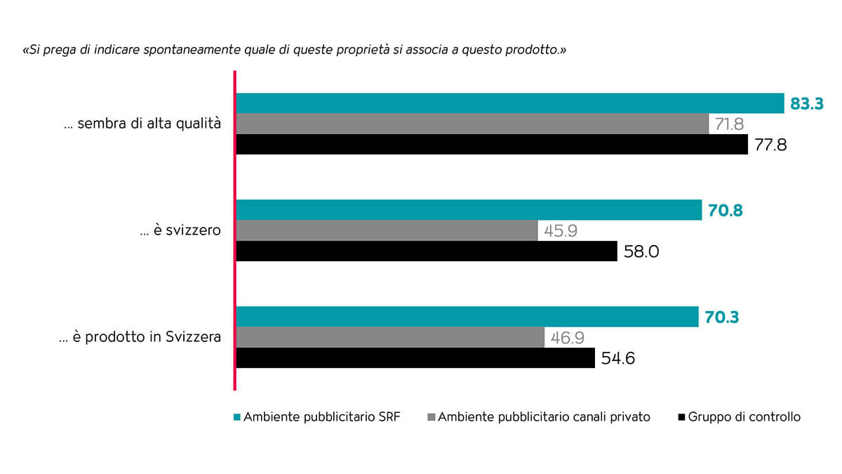 I tre studi realizzati dimostrano che la pubblicità televisiva in ambienti SRF vince tre volte rispetto alla concorrenza. È stato dimostrato che la pubblicità su SRF viene ricordata meglio («AdRecall Uplift»), che porta a una maggiore probabilità di acquisto e quindi a un maggiore volume di vendite («Purchase Uplift») e che il prezzo di un prodotto e quindi il suo valore viene valutato come più alto («Price Uplift»).