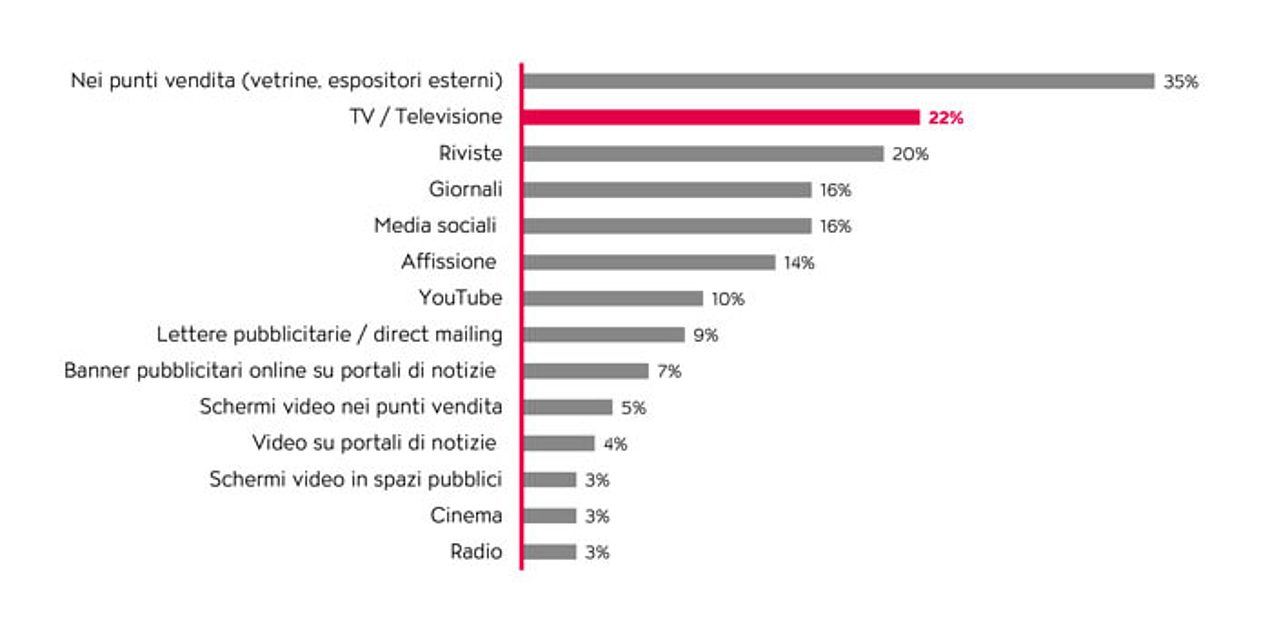 Tradizionalmente, le persone trovano principalmente ispirazione per le idee regalo presso i punti vendita. È quanto afferma il 35% degli intervistati. Oltre ai mercatini di Natale e ai rivenditori, la pubblicità ha un valore di ispirazione molto elevato. La TV in particolare è stata indicata come la prima fonte di ispirazionemediatica dal 22% degli intervistati (cfr. fig. 1).