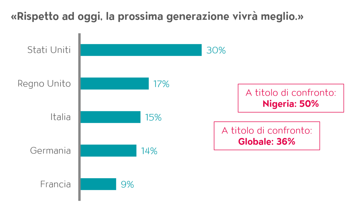 Lo scetticismo generale si riflette anche nella mancanza di ottimismo per il futuro. Solo il 36% delle persone intervistate a livello globale ritiene che la prossima generazione starà meglio di quella attuale. Nella maggior parte dei Paesi industrializzati questi valori sono ancora più bassi: ad esempio, solo il 9% in Francia, il 14% in Germania, il 15% in Italia, il 17% in Gran Bretagna e il 30% negli Stati Uniti è ottimista relativamente alle condizioni della generazione successiva. In controtendenza, in Paesi come la Nigeria l’ottimismo è maggiore (50%).