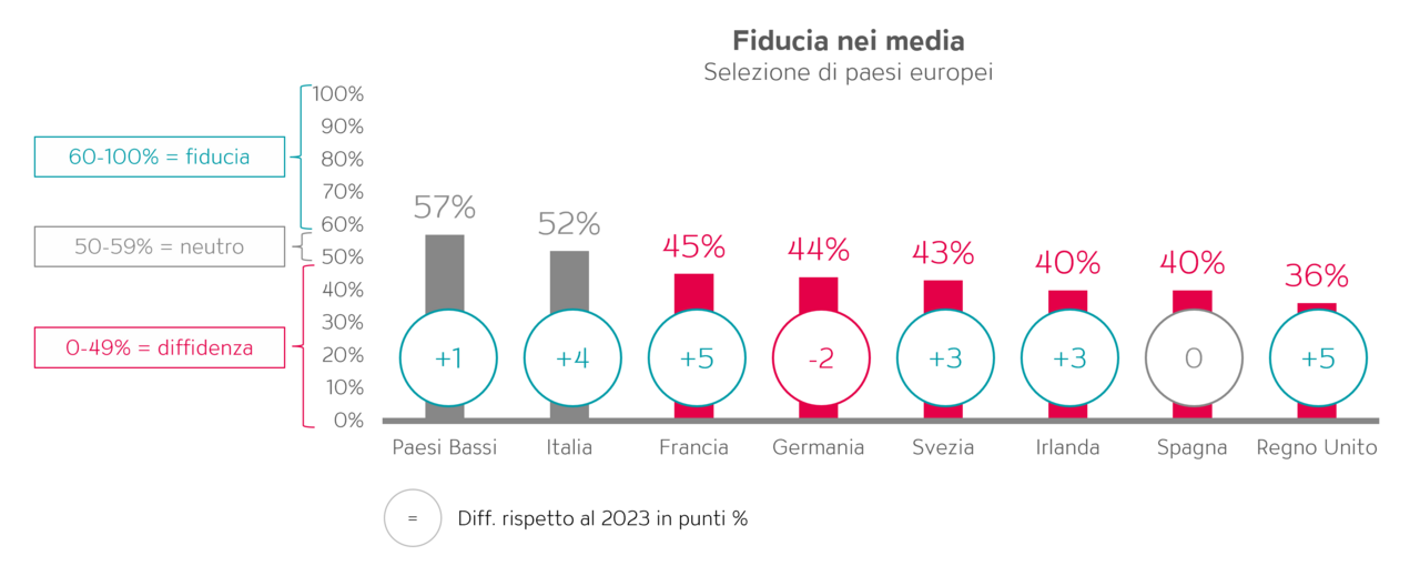 La fiducia nei media è piuttosto bassa in tutto il mondo. La maggior parte delle persone intervistate ritiene che i media preferiscano attirare più pubblico possibile, invece di comunicare alla popolazione ciò di cui dovrebbe essere informata (58%). Analogamente, il 53% pensa che i media sostengano un’ideologia piuttosto che informare il pubblico. A livello globale, in 14 Paesi su 28 prevale la sfiducia nei confronti dei media. Anche in Europa si è osservato un basso livello di fiducia nei media: 57% nei Paesi Bassi, 52% in Italia, 45% in Francia e 44% in Germania. Il valore medio globale in termini di fiducia nei media si attesta al 52%: valore che rappresenta un miglioramento di 2 punti percentuali dal 2023 (cfr. Figura 2).