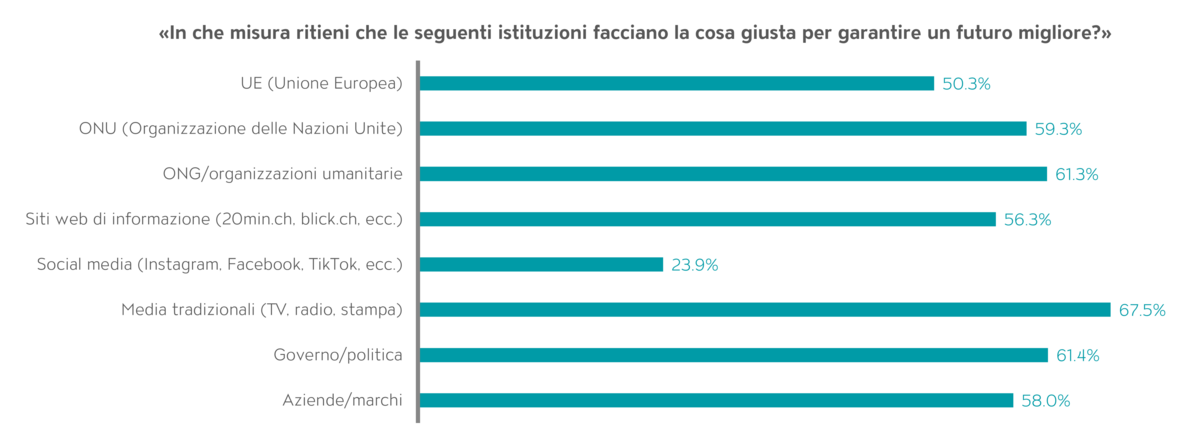 Tra i vari canali di informazione, i social media godono della minore fiducia, attestandosi solo al 42%. Rispetto al 2023, questo valore è addirittura diminuito di 2 punti percentuali. Contrariamente alle tendenze globali riportate nell’Edelman Trust Barometer, l’Admeira AdPanel – il nostro strumento di ricerca su temi ad hoc e per l’analisi dell’impatto pubblicitario – mostra un quadro differenziato per la Svizzera, in particolare per quanto riguarda i media. Lo studio «Future Trust Level» ha analizzato la fiducia della popolazione della Svizzera tedesca nelle istituzioni («In che misura ritiene che le seguenti istituzioni facciano ciò che è giusto per garantire un futuro migliore?»). È emerso che i media tradizionali (TV, radio, stampa) godono della fiducia più elevata per il futuro (67.5%). Li seguono i siti web di notizie con un livello di fiducia del 56,3%, mentre i social media (Instagram, Facebook, TikTok ecc.) registrano la fiducia più bassa per il futuro, con solo il 23.9%. Per aziende/marchi, il sondaggio registra una fiducia per il futuro pari al 58.0%.