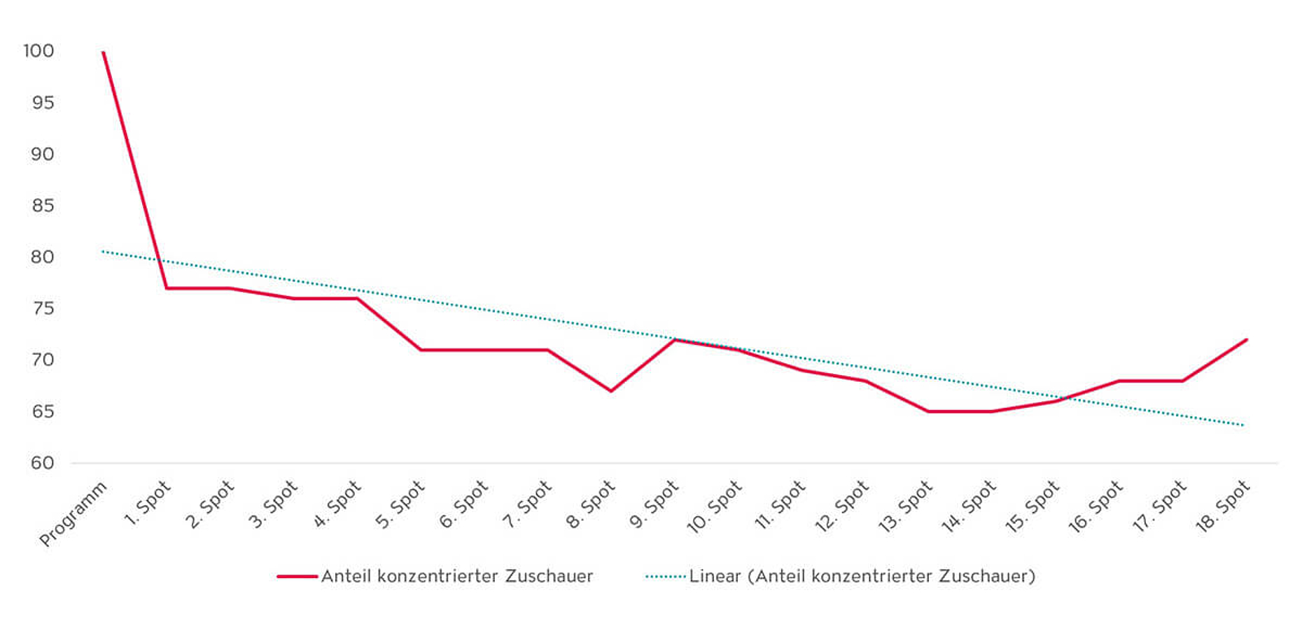Die Werbeblocklänge hat einen starken Einfluss auf die Aufmerksamkeit der Probanden. Über alle fünf Versuchsgruppen hinweg wird beobachtet, dass der per Eyetracking gemessene visuelle Kontakt der Augen mit dem Bildschirm annähernd linear zur Werbeblocklänge abnimmt (Abbildung 2). Das bedeutet, dass kürzere Werbeblöcke, wie sie im SRF-Werbeumfeld geplant werden, deutlich mehr visuelle Aufmerksamkeit für einzelne Spots erzielen als lange Werbeblöcke.